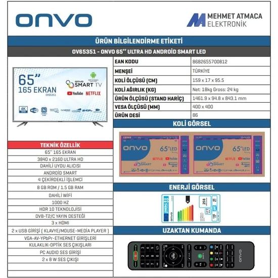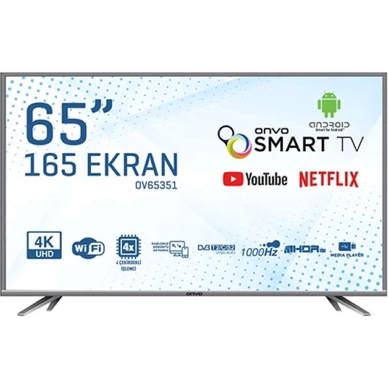 ONVO 65 ultra HD 4K Android smart LED TV, sunduğu gelişmiş özellikler ve şık tasarımıyla her kullanıcıya uygun olarak üretilir. ONVO OV65351 televizyon modeli, 4K uyumlu olmasıyla üst düzeyde görüntü netliği sağlayarak seyir keyfini arttırır. Geniş ürün yelpazesine sahip olan ONVO markasının bu modeli, kaliteli malzeme içerikleri ile uzun ömürlü olarak değerlendirilir. ONVO smart LED televizyon, sunduğu işlevsel özellikleri sayesinde her yaş kullanıcı tarafından sıklıkla tercih edilir. Herkese hitap eden ONVO OV65351 65" 165 ekran uydu alıcılı 4K ultra HD Android smart LED TV kampanyalarını takip ederek, avantajlı fiyat seçenekleri ile satın alabilirsiniz.